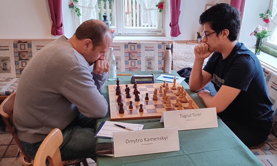 Wie schon gesagt,12 von 16 Spielern traten zur 1. Runde an, also noch 4 von 8 zu spielenden Partien. Es wurde tatsächlich nur 1 Partie (von 8) in der regulären langen Partie entschieden, alle anderen mussten in die Blitz-Verlängerung. Als schwäbischer Dähne-Pokalsieger hatte sich Dmytro qualifiziert und kam gegen den Münchner Tugrul Türel mit den schwarzen Steinen dran. Das Mittelspiel konnte Dmytro in sehr günstiger Bahnen lenken, konnte eine Figur gewinnen; leider sah er dabei nicht die für ihn günstige Fortsetzung (nämlich erst den König zurückdrängen und dann die Figur gewinnen), ließ den gegnerischen König in seine Bauernstruktur eindringen und es kam zu einem mehr als zweischneidigen Endspiel, bei dem Dmytro die Mehrfigur wieder hergeben musste und über remis nicht mehr hinauskam.