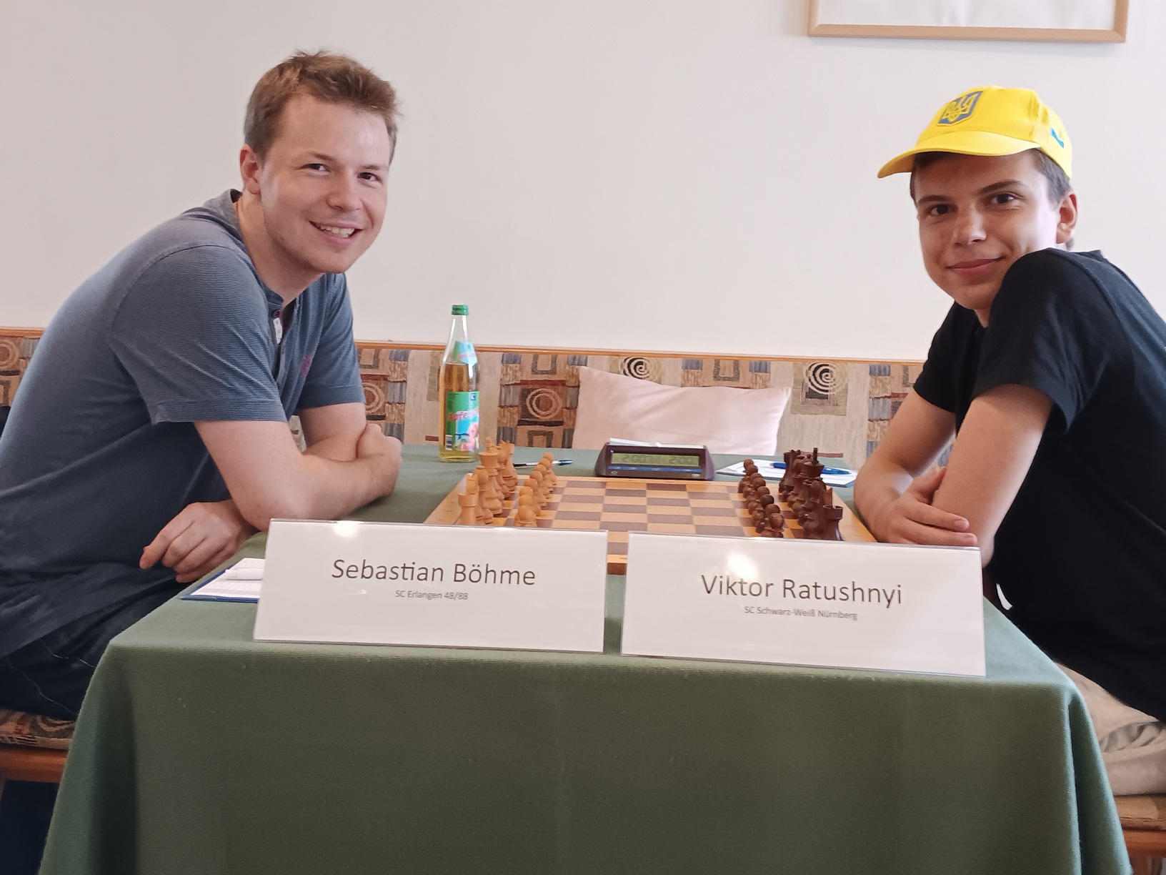 Das Finale fand dann statt zwischen Sebastian Böhme (Erlangen) und Viktor Ratushnyi (Nürnberg), also hatten sich die beiden Mittelfränkischen Teilnehmer für die Deutsche Endrunde qualifiziert. Ganz witzig: Sebastian Böhme hatte in allen drei Runden (vor dem Finale) nach Remis im Blitzentscheid gewonnen. Im Finale rechnete er im Endspiel etwas genauer und konnte sich dort dann durchsetzen.