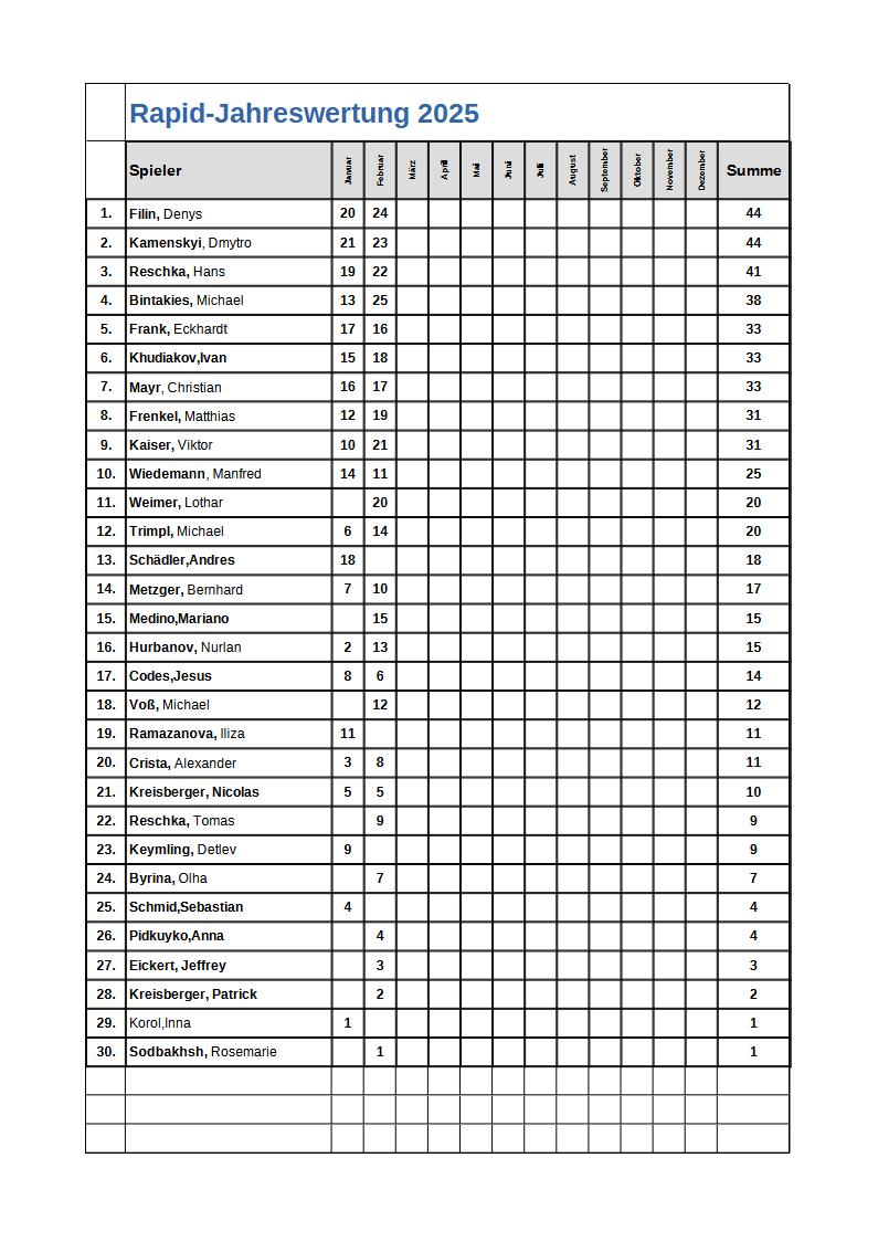 Mit 25 Teilnehmern gab es heute wieder eine Rekordbeteiligung. Es siegte Seriensieger des vergangenen Jahres, Michael Bintakies, mit 4,5/5 vor Denys und Dmytro.