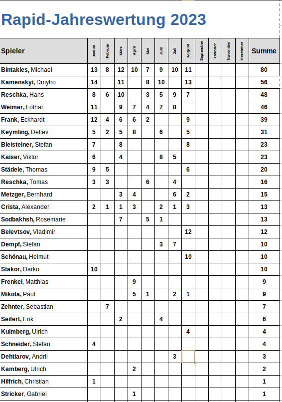 Jawohl, und hier ist sie, die Jahreswertung nach dem August-Turnier:
