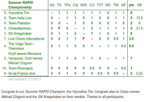Wie immer bedanke ich mich pflichtschuldig bei allen Mitspielern, die ihren Samstagabend geopfert haben, um den Erfolg möglich zu machen. Zum Abschluss des Turniers stehen als allerletztes Event dieser Sommer-Meisterschaft am 4. September noch gegen dieselben drei Gegner Team-Matches im Blitz und im Bullet an (die Einzeldisziplin-Wertung im Rapid war ja mit den gestrigen drei Runden bereits abgeschlossen).