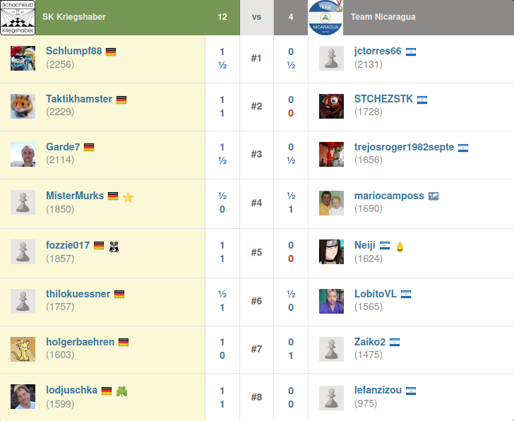 Wirklich los ging es dann um 19:00 Uhr mit Runde 4 gegen das Team Nicaragua, das wir – für mich etwas überraschend – heute mit 12:4 recht deutlich niederhalten konnten. Die Einzelergebnisse: