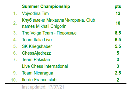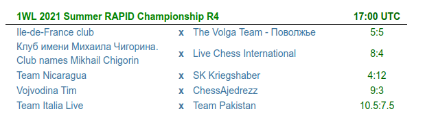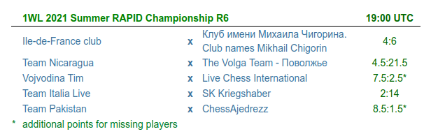 Heute, am 17.07.2021, waren in der Sommer-Meisterschaft der One World League LIVE wieder die RAPID-Runden 4 bis 6 zu spielen. Für unseren Klub stand außerdem zusätzlich auch noch das verschobene Match aus Runde 1 gegen Live Chess International auf der Agenda (ihr erinnert euch: Fußball-EM, zur gleichen Zeit lief damals das Spiel Deutschland – Portugal, daher die Verlegung).