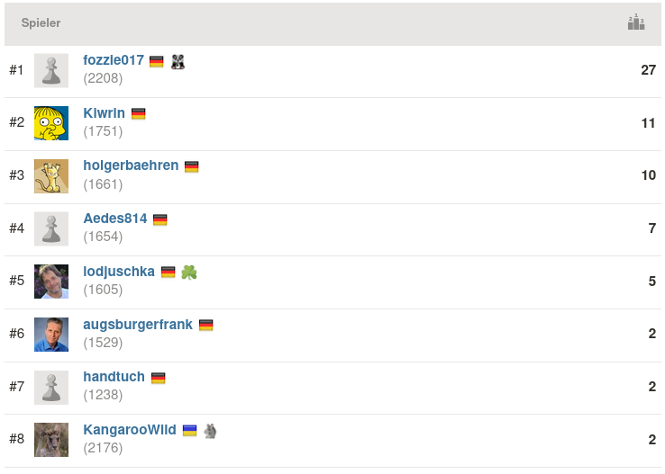 Fozzie legte heute mal wieder los wie die Feuerwehr und hatte nach 45 Minuten 27 Punkte und einen 7er-Streak, wenn ich es richtig gesehen hatte, während der nächste Verfolger noch einstellig war (oder jedenfalls nicht viel darüber). Hier das Wort Verfolger zu gebrauchen, ist da schon der reinste Euphemismus. Aber um den Rest der Truppe nicht zu doof aussehen zu lassen, streute Fozzie unauffällig eine Verlustpartie ein, in der er ein Matt in 1 übersah und damit seine Strähne selbst brach. Danke Michi, für sowas lieben wir dich 🙂