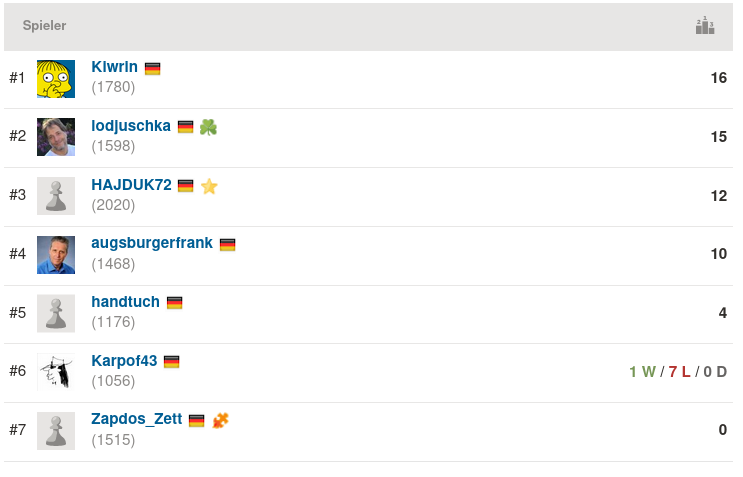 Waren ja mal wieder heißte Gefechte beim heutigen Mittwochsblitz. Erstmals konnte ich heute sogar Eckhardt zweimal in Folge besch… äh, besiegen. Das trug nicht unerheblich zu meiner Silbermedaille bei 🙂