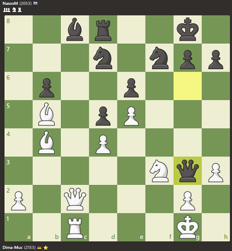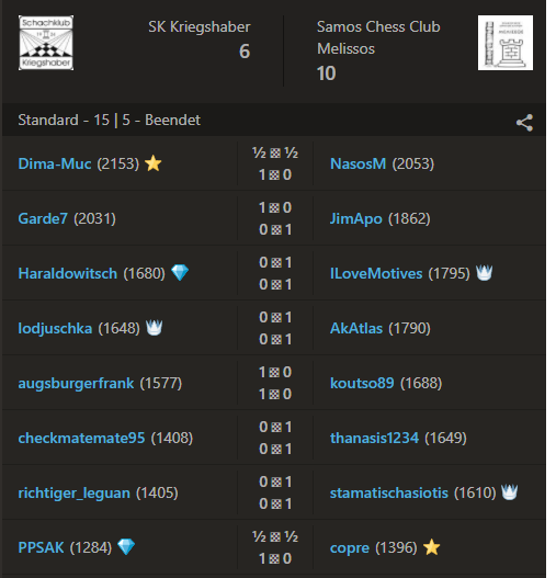 Die Spieler aus Samos wiesen hinsichtlich ihrer Wertungszahlen eine beachtliche Stärke auf, mit Ausnahme Brett 8 alle mindestens 1600. Insofern würde es kein Zuckerschlecken, soweit war es klar. Ich war in meine Partien so vertieft, dass ich live nichts von den anderen Begegnungen mitbekam, musste mir erst hinterher die Partien anschauen, als das Ergebnis schon feststand. Ist ja klar, wenn nur 3 Spieler (Dima, Patrick und ich) ein insgesamt positives Ergebnis aufwiesen, dann kann das nichts werden mit einem Mannschafts-Sieg. Besonders bitter war, dass Thomas seinen König in enger Umklammerung hatte, dafür aber einen Bauern vor der Umwandlung, und dann fiel ihm die Zeit.