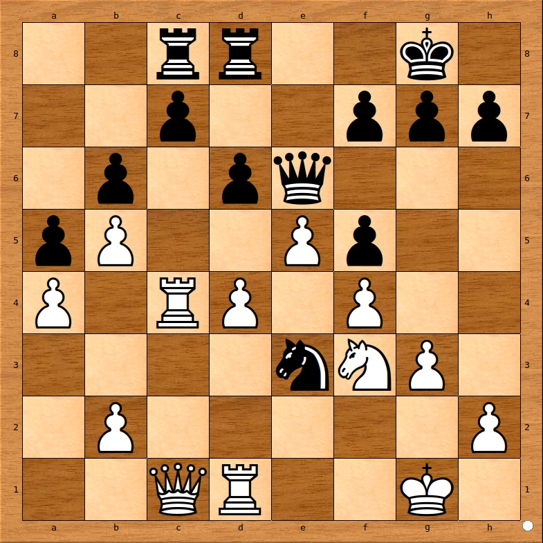 Wir sehen hier die Partie Lacrymaria – GleahciM aus der 4. Runde. Weiß hatte soeben 40.Kf2 gezogen, wonach Stockfish die Stellung als hoffnungslos verloren für Weiß bewertet – und das wäre sie wohl auch, hätte Schwarz nun anstatt des tatsächlich gespielten 20…Sxf4 zu 20…Dd3 gegriffen, wonach bei Weiß die Lichter ausgehen: Der Lc3 ist doppelt angegriffen, und rettet Weiß ihn mit z.B. 21.Le5, dann erliegt der weiße König nach 21…e3+ schnell dem kombinierten Mattangriff von D+S+B, oder der Bauer e3 läuft zur Grundreihe durch.