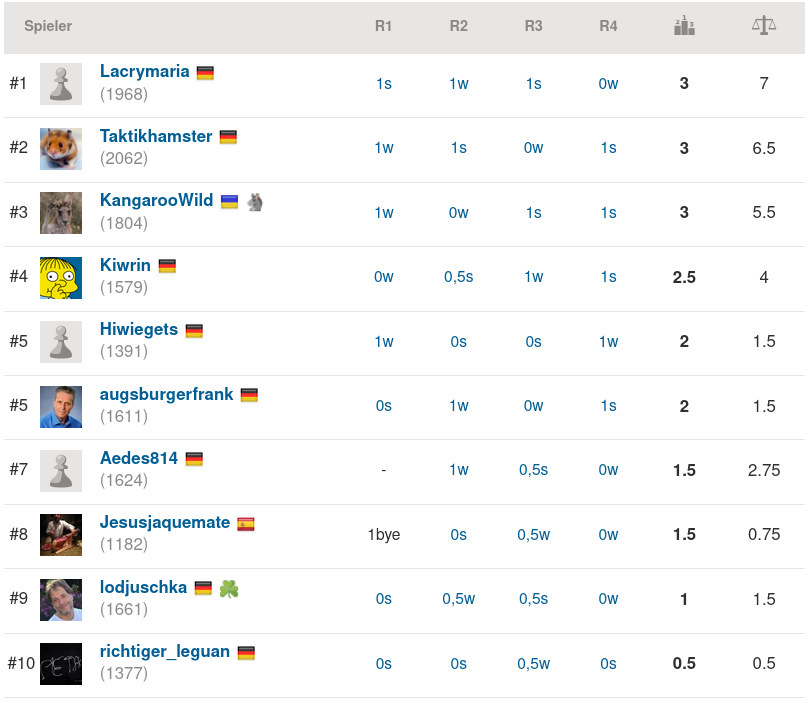 Jetzt aber zum Endstand des heutigen Turniers – übrigens: Obwohl 10 Teilnehmer mitmischten, was die Mindestzahl für ein 5-rundiges CH-System-Turnier wäre, spielten wir nur 4 Runden, weil einer der Protagonisten um ein paar Sekunden zu spät aufgesprungen war. Liebe Leute, wartets halt net immer bis zur allerletzten Sekunde, bevor ihr auf den Teilnehmen-Button drückts… Damit schont ihr auch meine Nerven. Und die von Ecki.