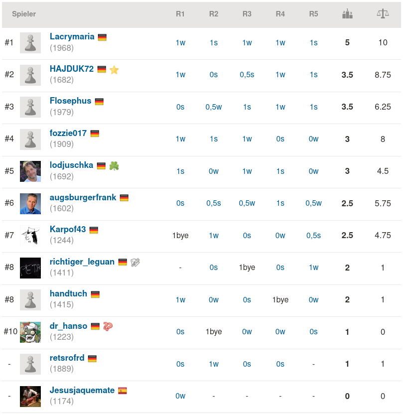 Eine recht gute Figur machte auch Uwe (Karpof43) bei seiner ersten Turnierteilnahme. Wenn das bisschen angesammelter Flugrost in Kürze wieder entfernt ist, darf man hier noch große Dinge erwarten. Dass er es noch kann, hat er jedenfalls heute gezeigt, z.B. in der Partie gegen HAJDUK72 – und auch Eckhardt musst in der Abschlussrunde lange um den halben Punkt zittern. Hoffentlich sehen wir diesen Spieler künftig regelmäßig in unseren Reihen.