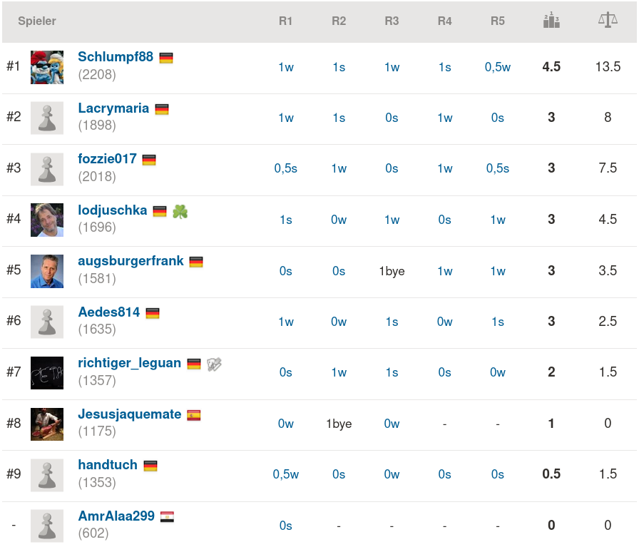 Angelockt von der deutlich verkürzten Bedenkzeit (wir spielten heute erstmals mit 10|3 anstatt wie bisher mit 15|5) trat diesmal sogar unser Blitzmonster Fozzie mit zum Rapid an. Doch auch er konnte nicht verhindern, dass nach den fünf zu absolvierenden Runden Schlumpf88 alleine an der Spitze stand – die gesamte fünfköpfige Verfolgergruppe war von ihm um 1,5 Punkte distanziert worden. Natürlich hatte dazu auch beigetragen, dass sich die Verfolger gegenseitig Punkte abnahmen. Der Endstand: