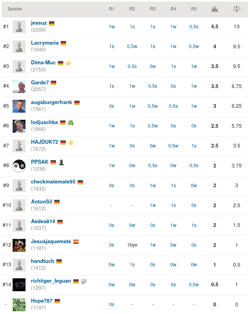 Das war ja heute mal ein starkes Turnier, wie wir es schon lange nicht mehr hatten. 15 Teilnehmer waren nicht nur von der Anzahl her gut, nein, auch qualitativ war diesmal richtig was geboten, so dass sich Thomas heute mal an der Spitze nicht langweilen musste. Ja, am Ende hatte er sogar mit den Medaillenplätzen gar nichts zu tun, so eng war es da oben im Wolkenkuckucksheim. Und von wo aus sie gleich alle eingeflogen kamen: Der lange verschollene jessuz aus Innsbruck, unser Giftpilz Lacrymaria irgendwo aus dem Oberbayrischen, und Dima-Muc aus der Landshauptstadt – von überallher eilten sie herbei um heute mal wieder die Klingen zu kreuzen. Daneben noch die „üblichen Verdächtigen“ (wieso nur muss ich dabei immer an Casablanca denken?) Garde7 und HAJDUK72 – kurzum, die Bude war gerammelt voll mit elitärer Gegnerschaft.