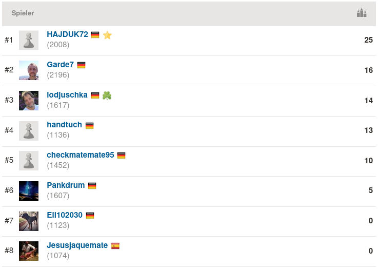 Allmählich lohnt es sich wirklich, mal in die Ergebnislisten der zurück liegenden Turniere zu schauen und zu überprüfen, wann zuletzt Roland bei einer seiner Teilnahmen eigentlich nicht Erster geworden ist. Das liegt gefühlt schon eine ganze Weile zurück. Auch heute lieferte er wieder eine beeindruckende Leistung ab und gab sich mit 7 aus 7 nicht den Hauch einer Blöße (genau genommen ist 7 aus 7 nicht korrekt ausgedrückt, da wir ja im Arena-Modus gespielt haben, und da gibts für einen Sieg stets mindestens 2 Punkte, plus den Streak-Bonus – aber er hat jedenfalls alle seine sieben Partien gewonnen). Thomas lag am Ende „nur“ auf Platz 2, mit 6 Siegen und 2 Niederlagen (eine davon gegen seinen Angstgegner aus der Kreisklassenmannschaft Kriegshaber III, humhum). Und ich selbst durfte mal wieder im Ohrensessel auf Rang 3 Platz nehmen – ihr wisst schon, mein Bronze-Abo…