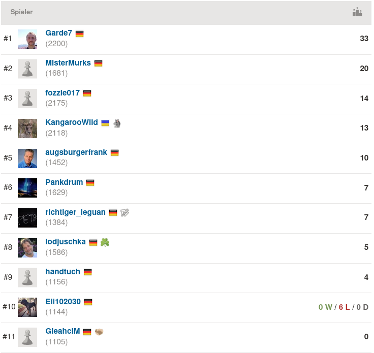Das war wie in alten Zeiten – Thomas ging mit 9 aus 9 auch gegen starke Gegnerschaft durch das Turnier wie ein heißes Messer durch die Butter. Sehr gut lief es heute aber auch für MisterMurks, der mit 5 Siegen und 3 Remisen ohne Niederlage auf dem zweiten Platz einkam und solche Blitz-Granaten wie Stas oder Fozzie hinter sich ließ. Letzterer startete suboptimal, rollte aber dann das Feld von hinten auf und hievte sich mit 5 Siegen und 2 Nullen trotzdem noch auf den Bronzerang.