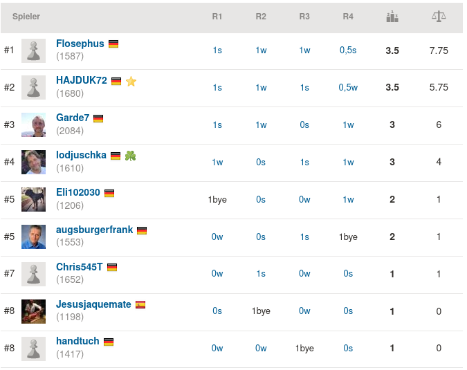 Früher wurden gekrönten Häuptern ja manchmal beschreibende Beinamen verpasst, wie Karl der Große oder Friedrich der Schöne. Gemessen daran müssten wir dem heutigen Tagessieger wohl den Beinahmen Flosephus der Zähe verpassen, denn wie er in seiner Partie gegen Garde7 den Gegner in einem wahrhaft schwerblütigen Kampf niederrang, das war schon aller Ehren wert. Und auch dem zweiten Titanen hielt er stand, indem er gegen unseren neuen Seriensieger HAJDUK72 das Remis festhalten konnte, so dass er am Ende vor ebendiesem nach Wertung knapp die Nase vorne hatte. Herzlichen Glückwunsch zum Turniersieg!