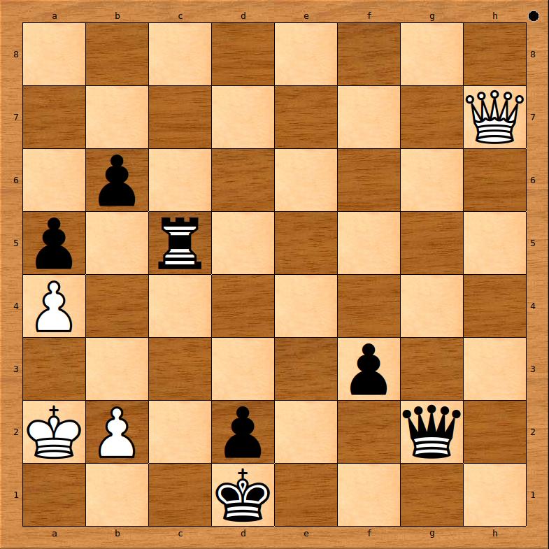 Der Spieler handtuch, mit den schwarzen Steinen spielend, ist hier am Zug und steht ohne Zweifel klar auf Gewinn – da packt ihn wieder seine alte Krankheit und er will den Ball quasi ins Tor hinein tragen. Da er schon seit etlichen Zügen keine Ruhe vor den Schachs der weißen Dame hatte finden können und somit auch nie zum Mattsetzen gekommen war, verfiel er nun auf die Idee, mit dem König einen Schritt beiseite zu gehen, um auch noch den d-Bauern in eine zweite Dame umzuwandeln. Doch anstatt den Seitwärtsschritt nach rechts (e1) zu tun, wählte der schwarze Monarch die fatale andere Seite, und so sahen die Zuschauer entsetzt folgendes Finale: 73…Kd1-c1?? 74.Dh7-b1#