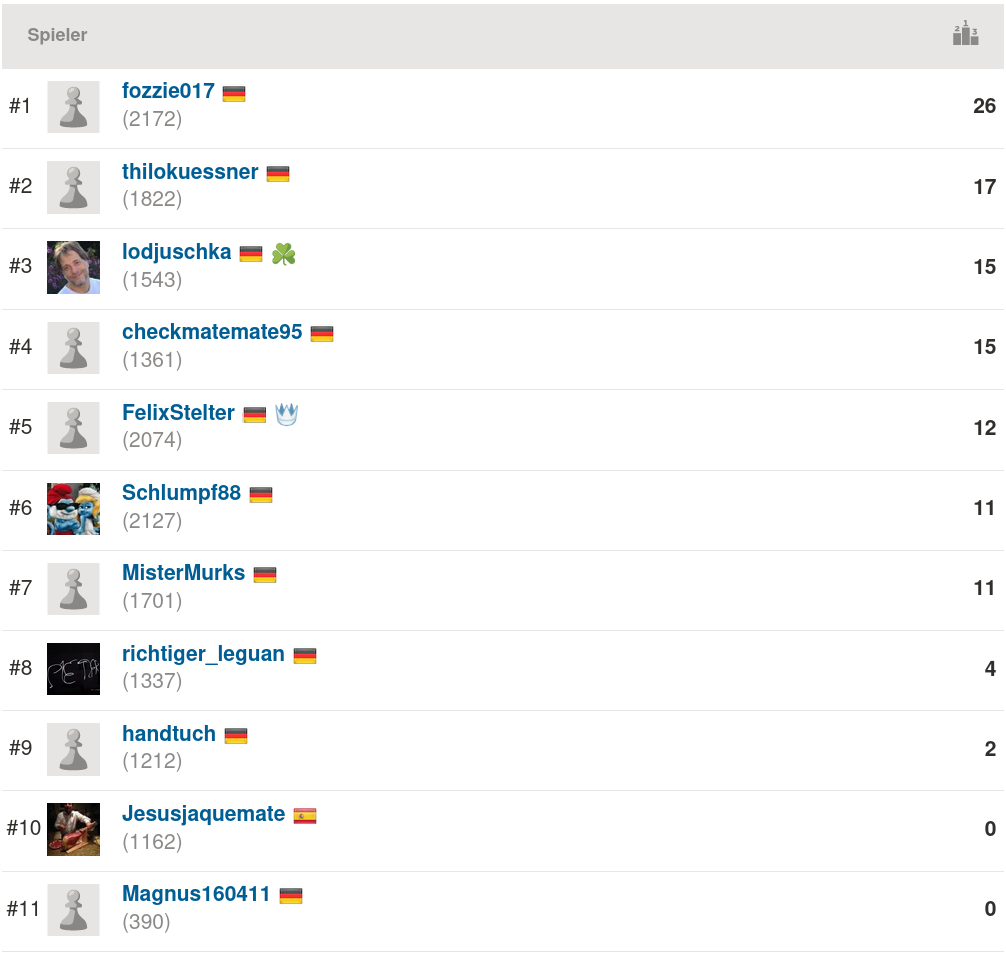Ein Kessel Buntes war früher der Titel einer in der DDR sehr beliebten, mit großem Aufwand präsentierten Unterhaltungsshow – und bunt war das Teilnehmerfeld heute auch bei uns: Von irgendwoher schwebte Fozzie aus dem Nirwana wieder ein und spielte sein unnachahmliches Astral-Blitzschach, womit er dem Rest des Feldes um Lichtjahre enteilte. Auch Thilo griff nach mehrwöchiger Schach-Abstinenz wieder zum Handwerkszeug und zeigte mit dem zweiten Platz, dass er in der Zwischenzeit keineswegs etwa Rost angesetzt hatte. Und dann trudelten da auch noch – äußerst erfreulich!! – zwei Neuzugänge aus unserer Jugendabteilung mit in die Teilnehmerliste rein, nämlich Peter und Magnus (nein, nicht Carlsen – der andere). Ein herzliches Willkommen daher auch diesen beiden, verbunden mit der Hoffnung, dass wir euch ab jetzt regelmäßig bei unseren Online-Turnieren begrüßen dürfen!