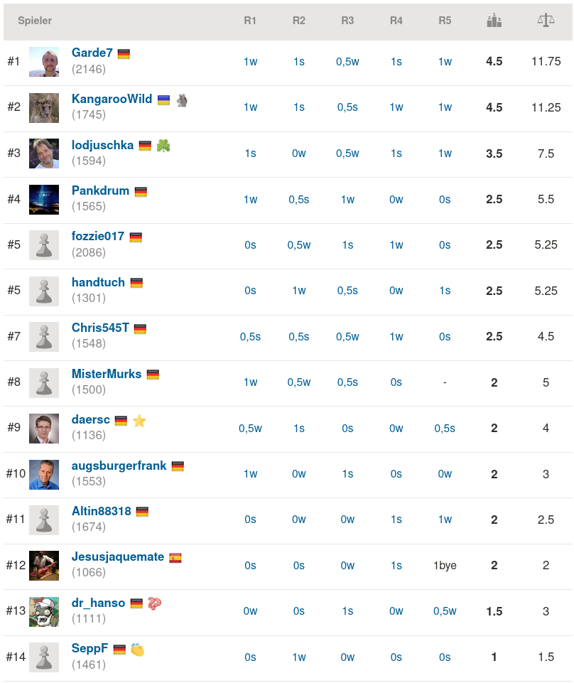 Am Ende des Tages war es dann die Rückkehr des Königs auf seinen angestammten Thron: Der Zieleinlauf lautete Thomas vor Stani mit je 4,5 aus 5. Beide hatten nur das Remis gegeneinander abgegeben und den Rest gewonnen. Da sie nicht genau die gleichen Gegner hatten, drückte sich Thomas mit der minimal besseren Feinwertung als erster über die Ziellinie und sicherte sich Gold. Bronze ging an mich selbst, nachdem ich diesmal ja nicht gegen Eckhardt verlieren musste und so auf 3,5 Points kam.