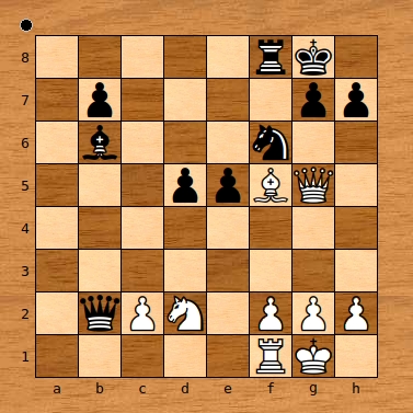 Aus einer selten gespielten Eröffnungsvariante heraus war es Helmut (Schwarz) nach hochspannendem Verlauf gelungen, im 21. Zug diese für ihn deutlich vorteilhafte Stellung zu erreichen. Stockfish bewertet sie übrigens mit etwa -3.50, also Gewinnstellung für Schwarz. Die Maschine empfiehlt hier den Zug 21…e4 – nicht so sehr, um die Deckung des Bc2 durch den Lf5 zu unterbrechen. Viel wichtiger ist es hier stattdessen zu verhindern, dass der weiße Springer über f3 an die Front gelangen kann, denn ohne ihn wird Weiß keine ernsthaften Drohungen gegen den schwarzen König erzeugen können. Unter diesem Gesichtspunkt war bereits die von Helmut gewählte Fortsetzung  21…Dd4? nicht mehr optimal (Stockfish: +0.00). Es folgte 22.Sf3 Dc3 23.Le6+ Kh8 24.Sxe5, wonach wir die Stellung von Diagramm 136 erreicht haben: