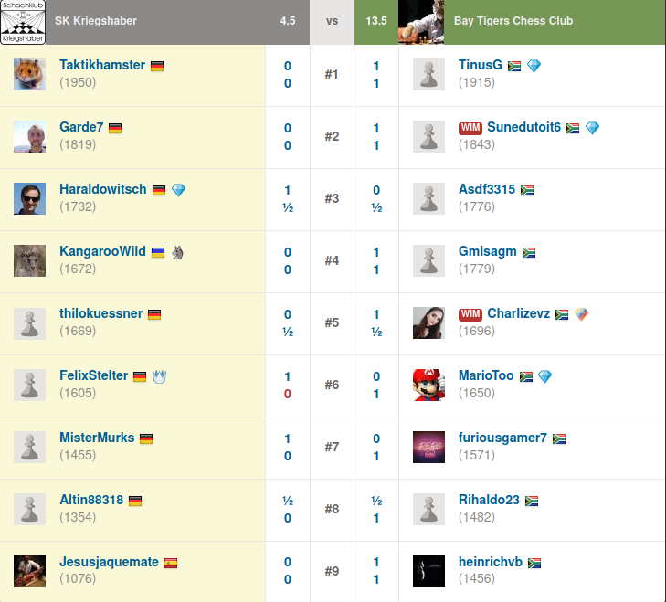 Gegen den Bay Tigers Chess Club aus Port Elizabeth (Südafrika) gab es in unserem letzten Spiel der Clubs League mit 4½:13½ leider nochmal eine Niederlage, die für mich auch unerwartet hoch ausfiel. Dabei hatten die Gegner noch nicht einmal alle zehn Bretter voll besetzt gekriegt, so dass wir im Endeffekt noch zwei kampflose Punkte dazu bekommen, aber was solls – am Ergebnis ändert es nicht viel. Hier die Einzelergebnisse: