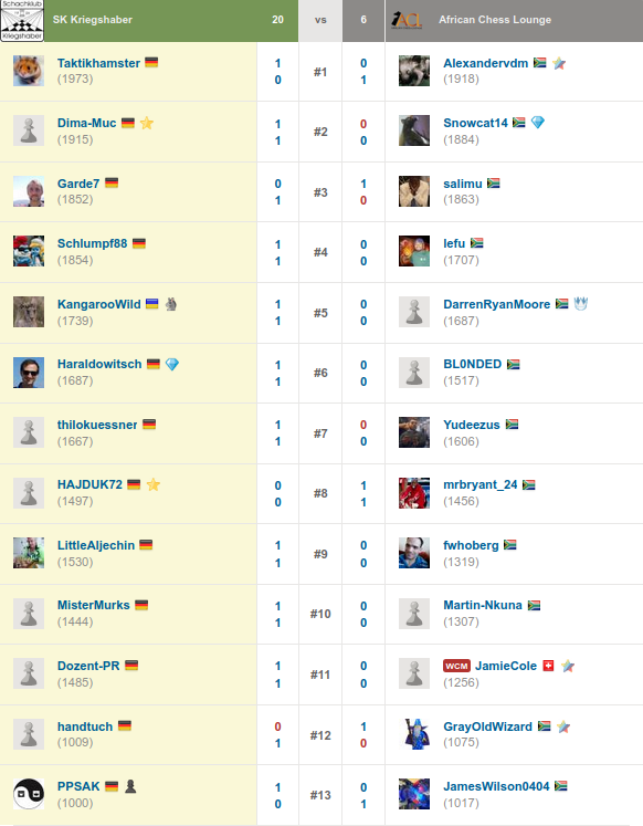 Kriegshaber gewinnt in Division A hoch mit 20:6 gegen African Chess Lounge