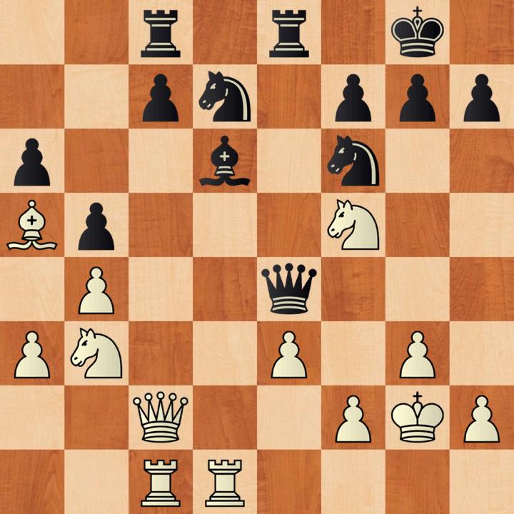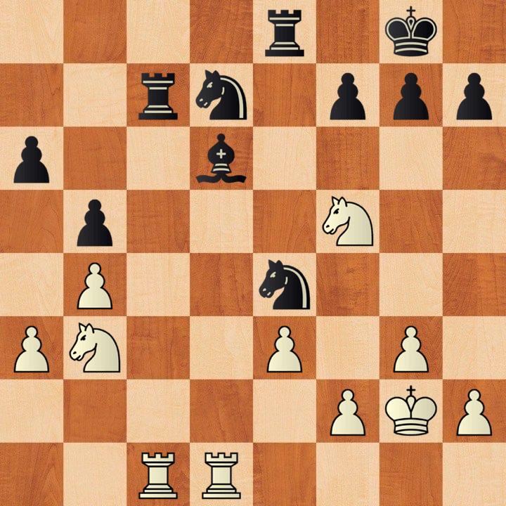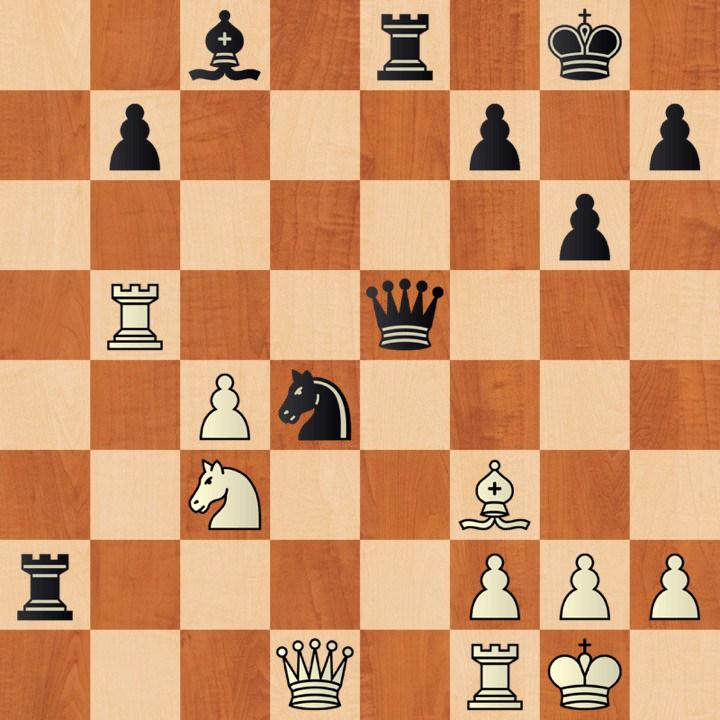 Weiß hatte zuletzt 24.Sd5-c3 gezogen, und Stanis Gegner antwortete hier aus der Diagrammstellung heraus nun 24…Sxf3+? – ein Fehler, da nun neben der Dame auch der Ta2 weiterhin hängt. Es folgte 25.Dxf3 De6 26.Sxa2 mit Mehrturm und baldigem Gewinn für Stani. Bravo!