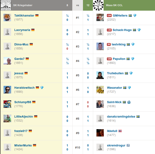 Irgendwie war unser Gegner aus der fünften Runde der CC Clubs League doch recht minimalistisch eingestellt: Der mit Titelträgern nur so gespickte Wasa SK aus Stockholm hat über 130 Mitglieder, aber sie besetzten nur die Mindestzahl an Brettern (zehn) – diese jedoch fast durchweg mit bärenstarken Spielern. Die Hälfte waren Titelträger; man sehe die Aufstellung: