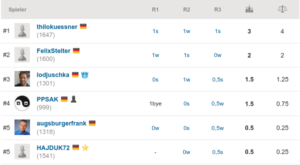 Heute gab es bei nur 6 Teilnehmern und 3 Runden folgenden Zieleinlauf: