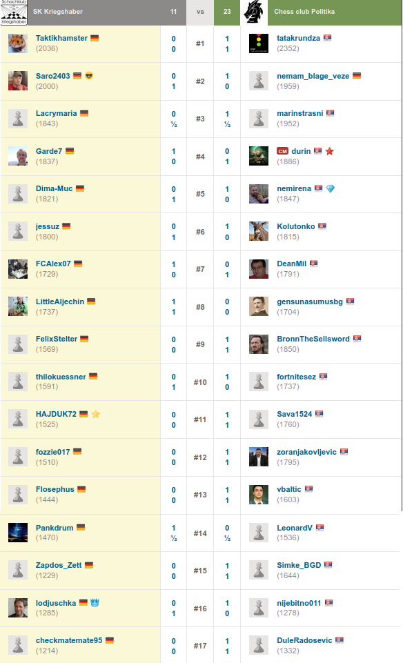 Am Samstag, 30.05.2020, spielten wir unser zweites Team-Match in der CC Clubs League, Division A. Gegner war der von vornherein als sehr stark eingeschätzte Schachklub Politika aus Belgrad, und die Jungs aus der serbischen Hauptstadt wurden ihrer Favoritenrolle mit dem Endergebnis von 11:23 letztlich auch vollends gerecht. Anerkennend müssen wir feststellen, dass diese Schuhe einfach noch eine Nummer zu groß für uns waren – und das, obwohl wir mit den starken Gaststpielern Taktikhamster vom SC Leinfelden sowie Alex Billing und vielen unserer eigenen Top-Cracks (darunter auch frisch eingestiegen: Pilzdoktor Christoph) durchaus konkurrenzfähig aufgestellt waren. Aber wenn von 17 Serben praktisch ein Drittel schon IM-Stärke aufweisen, stoßen wir halt mit unseren Möglichkeiten einfach auch an Grenzen.