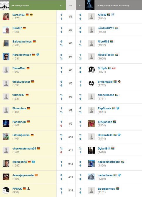 Ich selbst hatte das Glück, unser Team relativ schnell mit 1:0 in Führung bringen zu können. Als ich dann nach meiner ebenfalls rasch gewonnenen zweiten Partie auf den Zwischenstand schaute, führte Kriegshaber bereits mit 8:3 – das sah gut aus! Irgendwann hieß es 10½:6½, dann 12½:6½, und als der Punktezähler um 19:50 Uhr schließlich auf 14½:6½ (und damit auf über 50% der erreichbaren Punkte) kletterte, war uns der Sieg nicht mehr zu nehmen. Zwar machte Cape Town im Endspurt noch einige Punkte gut, so dass es am Ende 17:11 hieß, aber auch das ist immer noch ein deutlicher Sieg.