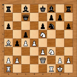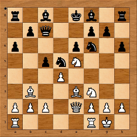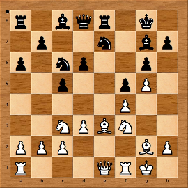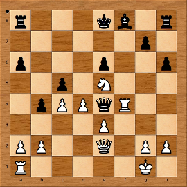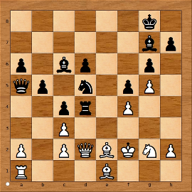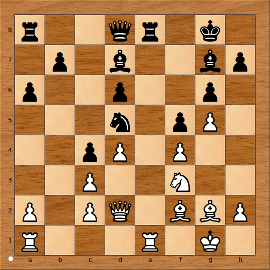 Schwarz am Zug. Bis hierher waren beide Spieler der Partie Gheorghiu – Filip, Tel Aviv 1964, gefolgt, in der Schwarz nun mit 13… Ld6 fortsetzte. Helmut wollte dagegen mittels 13… b7-b5 am Damenflügel expandieren, was von Viktor stark mit 14.c4! gekontert wurde. Es folgte 14… Sxe3 15.fxe3, wodurch sich dem Weißen sehr willkommen die f-Linie öffnete. Nach 15… b4 16.La4+ war Schwarz in keiner beneidenswerten Lage: