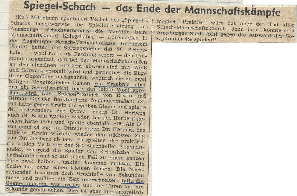 Am 10.Februar 1962 kam es in der Augsburger Verbandsklasse zur Begegnung Kriegshaber I gegen Bärenkeller I. Bei uns belegten inzwischen (nach dem Weggang unseres langjährigen Spitzenspielers Paul Herden zum Konkurrenzverein) Erwin und Otmar Gänsler die Spitzenbretter 1 und 2. Angeregt durch ein Ereignis bei der damaligen Schacholympiade (wenn ich mich entsinne: die Begegnung zwischen der Sowjetunion und Kuba) hatten sich unsere beiden Spitzenbretter überlegt, dass man das nachmachen könne.
