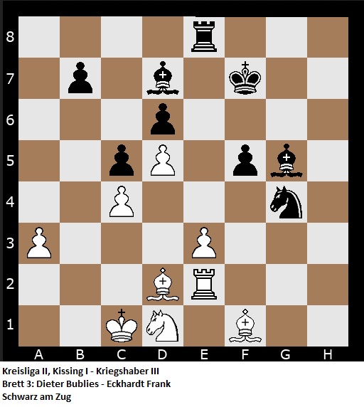 In folgender Stellung erobert Schwarz zwingend einen Bauern und hat die viel druckvollere Stellung; mit dieser Partie waren wir 4 : 3 in Führung gegangen: