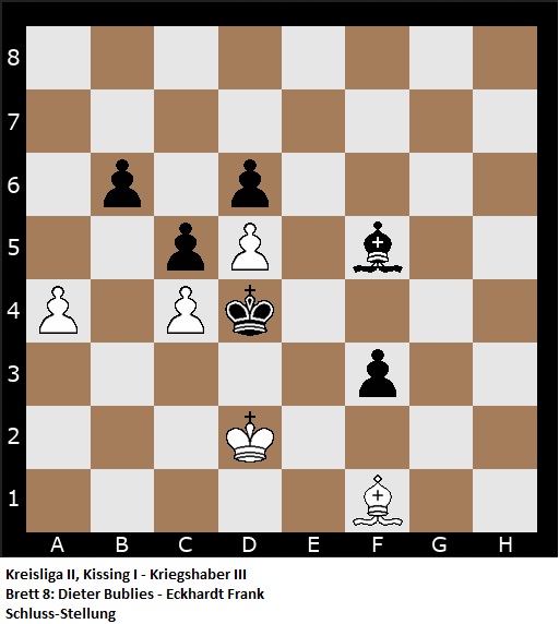 Aber man kann ja auch mal einen stillen Zug einschieben: 2. … Kd5: (Thomas spielte hier das etwas schwächere 3. Kh5, das Motiv blieb aber das selbe) 3. g4-g5 h6xg5 4. h4xg5 und jetzt der Knaller: man gibt der Läufer her und gewinnt: 4. … Ke5 Jetzt muss Weiß die Deckung des f5-Bauern aufgeben und der Schwarze König gewinnt die Opposition: