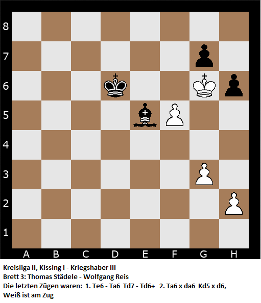 Beim Stand von 3 : 3 liefen noch die Partien an Brett 3 und Brett 8. Wir dachten kurz darüber nach, beide Partien remis zu geben, aber Wolfgang Reis hatte mit einer Mehrfigur (gegen drei Bauern) im Turmendspiel sichtlich Schmerzen, einen halben Punkt freiwillig abzugeben. Er erzwang fast a tempo Turmtausch und es kam zu folgender Stellung: